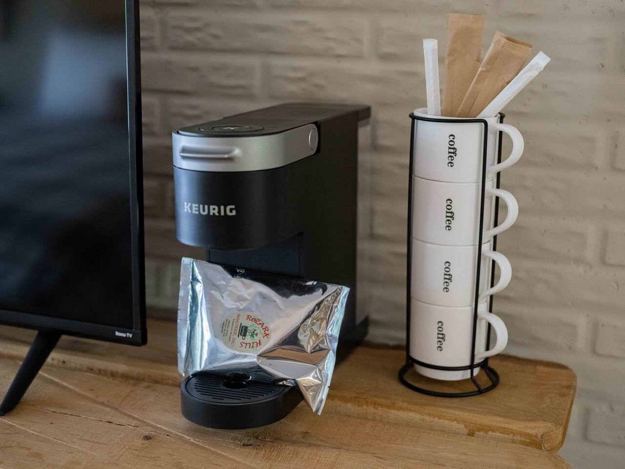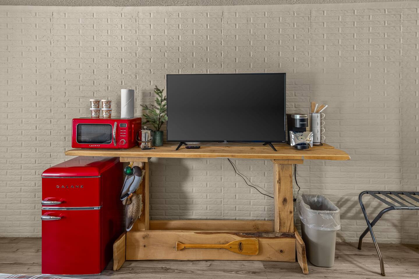 Room 305 is a studio style, front, second-level unit that requires a walk up a short flight of stairs: • Microwave & Minifridge • Keurig coffee maker w/ locally roasted coffee, creamer, & sugar • 2 Mountain Valley Spring Waters & Bob’s Oatmeal Cups • Covered table w/ 2 chairs outside your room • White noise maker for sleeping • Bedside USB phone/device charger. • Guests may use the Roku TV to access their own personal steaming platforms. THE BUILDING & COMMON AREAS: • Saltwater Pool • Fire Pit • Covered Pavilion • Ice machine & water, soda vending machine • Onsite Parking • Pet relief station