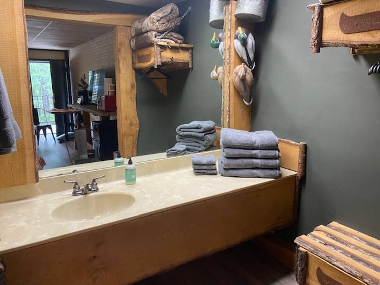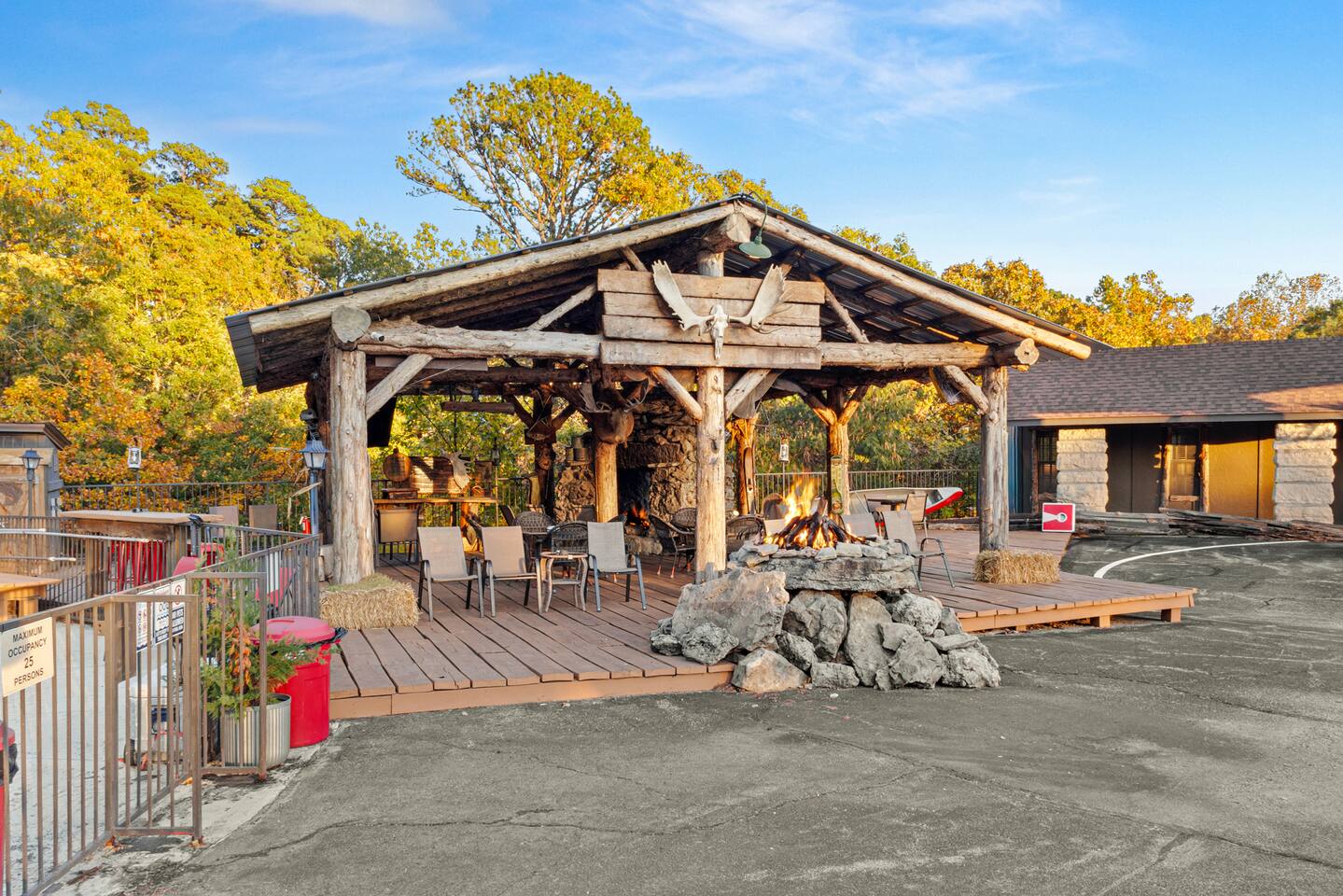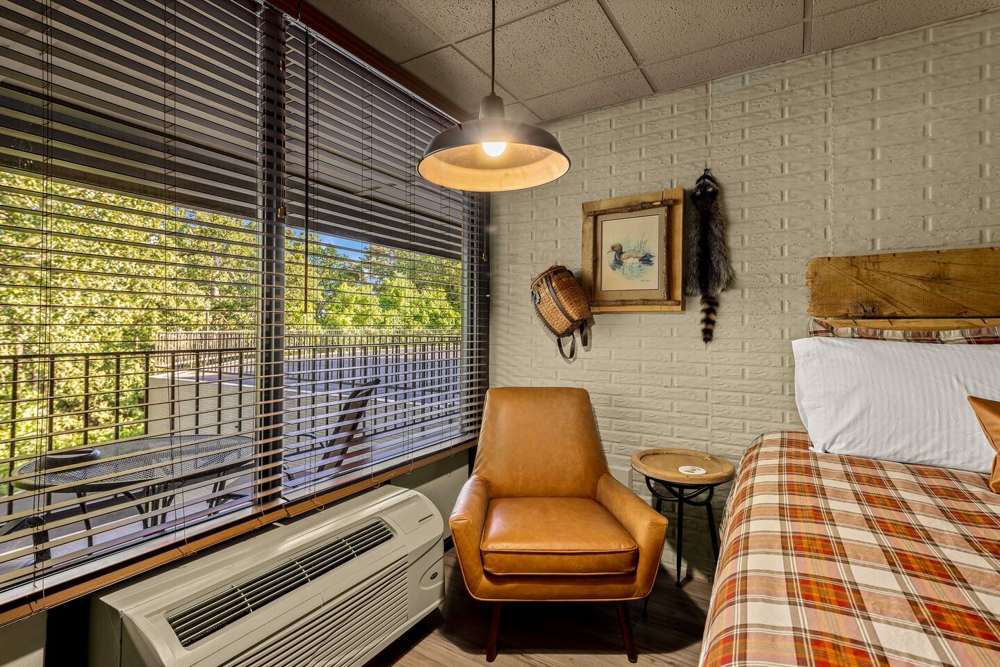 A studio style ground floor unit on the back side of the building, facing the woods. A good choice if you want a quieter experience. • Microwave & Minifridge • Keurig coffee maker w/ locally roasted coffee, creamer, & sugar • Mountain Valley Spring Waters & Bob’s Oatmeal Cups • Covered table w/ 2 chairs outside your room • White noise maker for sleeping • Bedside USB phone/device charger. THE BUILDING & COMMON AREAS: • Saltwater Pool • 2 Fire Pits • Covered Pavilion • Ice machine & water, soda vending machine • Onsite Parking • Pet relief station