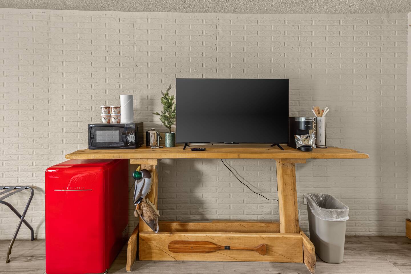 Room 303 is a studio style front, second-level unit that requires a walk of a short flight of stairs: • Microwave & Minifridge • Keurig coffee maker w/ locally roasted coffee, creamer, & sugar • 2 Mountain Valley Spring Waters & Bob’s Oatmeal Cups • Covered table w/ 2 chairs outside your room • White noise maker for sleeping • Bedside USB phone/device charger. • Guests may use the Roku TV to access their own personal steaming platforms. THE BUILDING & COMMON AREAS: • Saltwater Pool • Fire Pit • Covered Pavilion • Ice machine & water, soda vending machine • Onsite Parking • Pet relief station