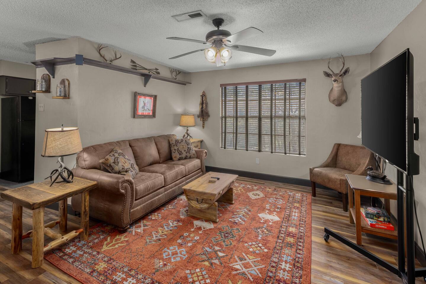 This 1 bedroom apt. resides in Stonegate Lodge, a lodge style Airbnb motel. A mix of comfort, vintage style, and rustic touches. Just outside the front door, you can enjoy the common area fire pits, pavilion, corn hole game, and saltwater pool! 2 mi. to HISTORIC DOWNTOWN Eureka Springs 4 mi. to Thorncrown Chapel 6 mi. to Lake Leatherwood KEY FEATURES: ☀ Full kitchen, full bath, separate bedroom, &living room. ☀ 50” Roku TV ☀King-sized Bed ☀ Saltwater Pool ☀ Fire Pit & Covered Pavilion