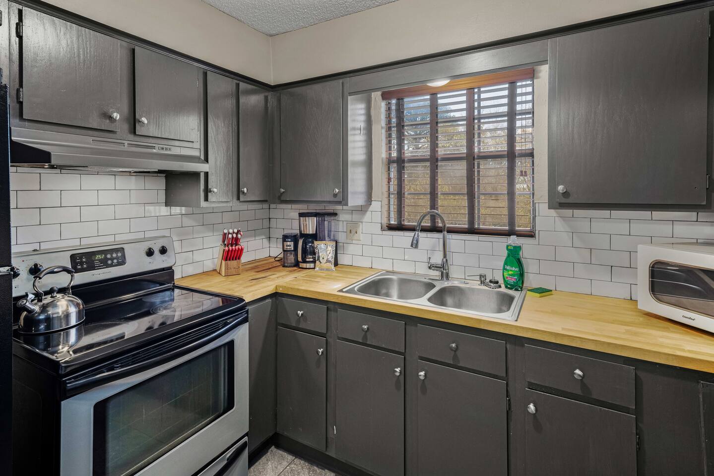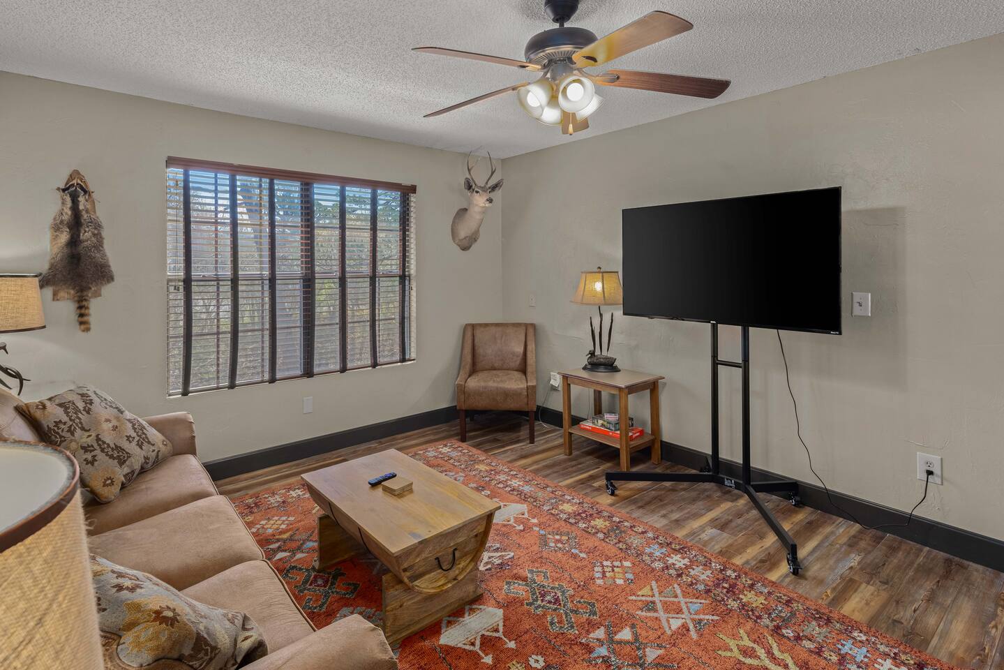 The Bear’s Den Apartment is a one bedroom ground floor unit on the front side of the Stonegate Lodge building: • Full Kitchen & bath • King-sized Bed • Coffee maker w/ locally roasted coffee, creamer, & sugar • 2 Mountain Valley Spring Waters & Bob’s Oatmeal Cups • White noise maker for sleeping • Bedside USB phone/device charger. • Guests may use the Roku TV to access their own personal steaming platforms. THE BUILDING & COMMON AREAS: • Saltwater Pool • Fire Pit • Covered Pavilion • Ice machine & water, soda vending machine • Onsite Parking • Pet relief station