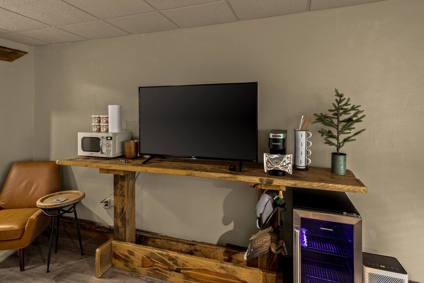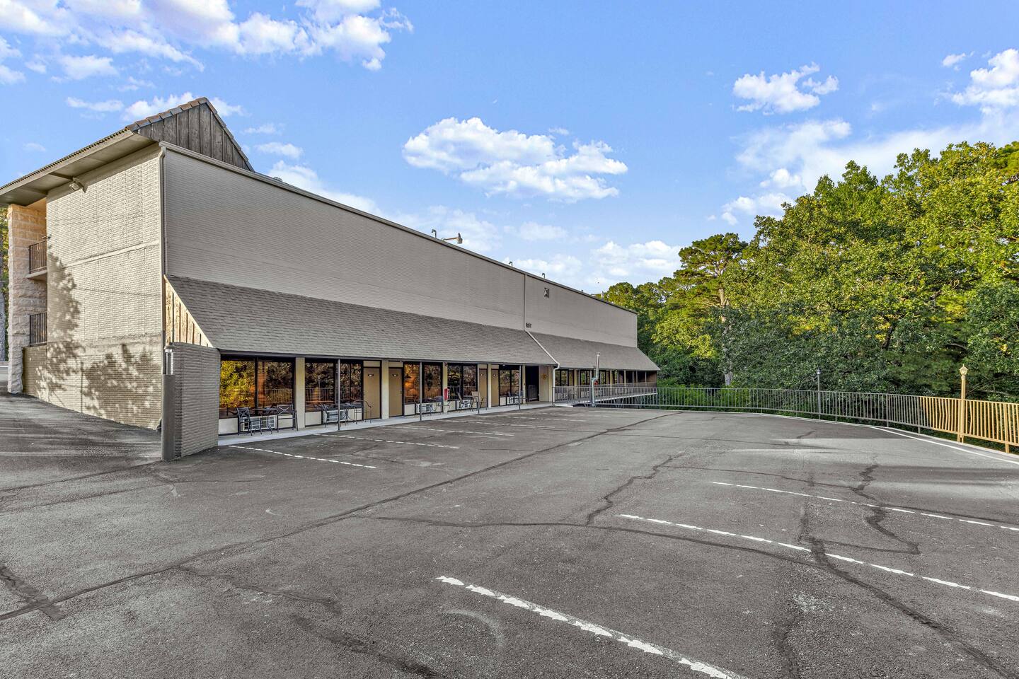 Unit 101 is a studio style ground floor unit on the back side of the building, facing the woods. A good choice if you want a quieter experience. It requires climbing down a few steps to the back level. • Dining table w/ 2 chairs • Microwave & Minifridge • Keurig coffee maker w/ locally roasted coffee, creamer, & sugar • 2 Mountain Valley Spring Waters & Bob’s Oatmeal Cups • Covered table w/ 2 chairs outside your room • White noise maker for sleeping • Bedside USB phone/device charger. • PAYA bath products • May use the Roku TV to access your own personal steaming platforms. THE BUILDING & COMMON AREAS: • Saltwater Pool • 2 Fire Pits • Covered Pavilion • Ice machine & water, soda vending machine • Onsite Parking • Pet relief station