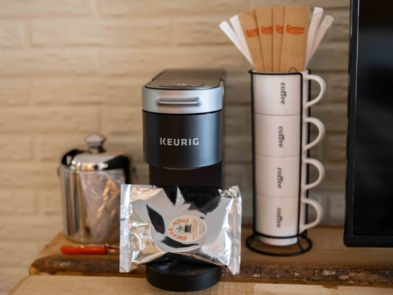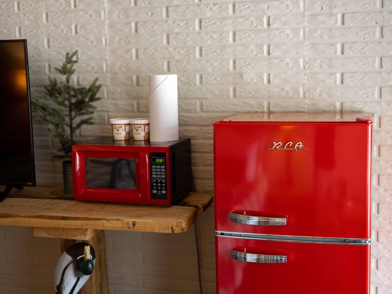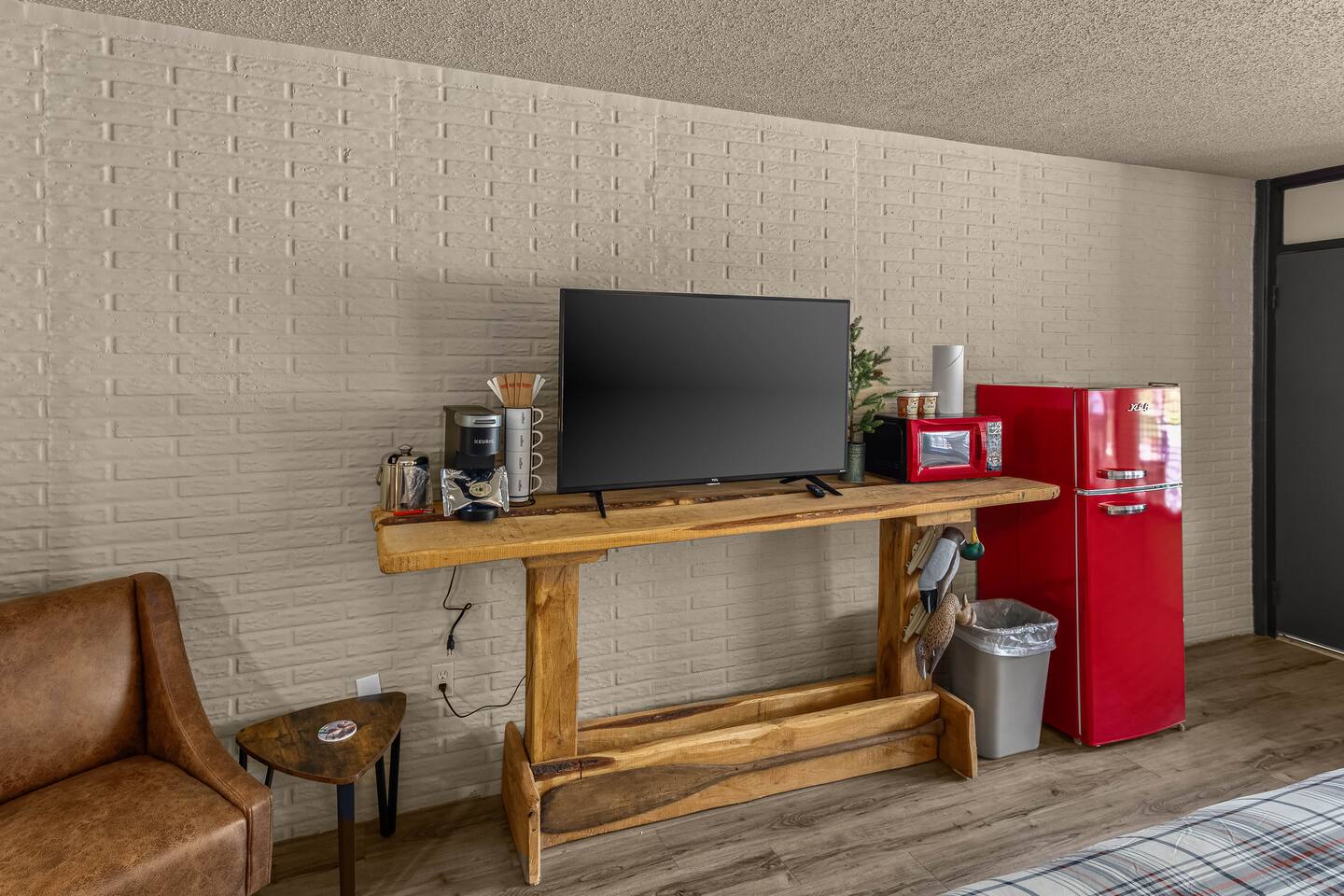 Room 302 is a studio style front, second-level unit that requires a walk of a short flight of stairs: • Dining table w/ 2 chairs • Microwave & Minifridge • Keurig coffee maker w/ locally roasted coffee, creamer, & sugar • 2 Mountain Valley Spring Waters & Bob’s Oatmeal Cups • Covered table w/ 2 chairs outside your room • White noise maker for sleeping • Bedside USB phone/device charger. • Guests may use the Roku TV to access their own personal steaming platforms. THE BUILDING & COMMON AREAS: • Saltwater Pool • Fire Pit • Covered Pavilion • Ice machine & water, soda vending machine • Onsite Parking • Pet relief station