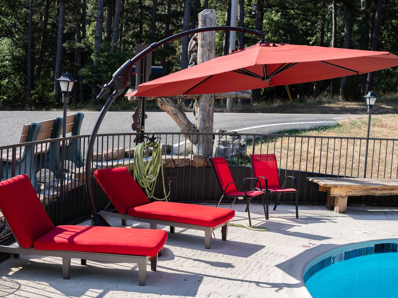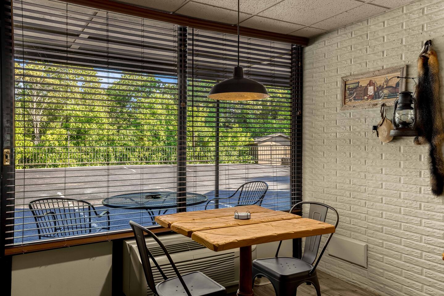 Room # 109 is a studio style ground floor unit on the back side of the building, facing the woods. A good choice if you want a quieter experience: • Dining table w/ 2 chairs • Microwave & Minifridge • Keurig coffee maker w/ locally roasted coffee, creamer, & sugar • 2 Mountain Valley Spring Waters & Bob’s Oatmeal Cups • Covered table w/ 2 chairs outside your room • White noise maker for sleeping • Bedside USB phone/device charger. • Smart TV w/Hulu+ Subscription THE BUILDING & COMMON AREAS: • Saltwater Pool • Fire Pit • Covered Pavilion • Ice machine & water, soda vending machine • Onsite Parking • Pet relief station