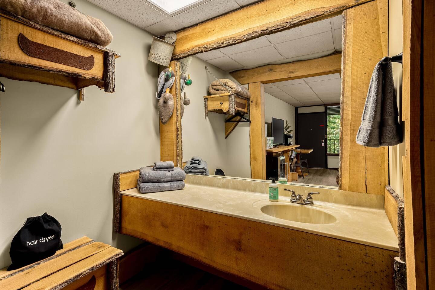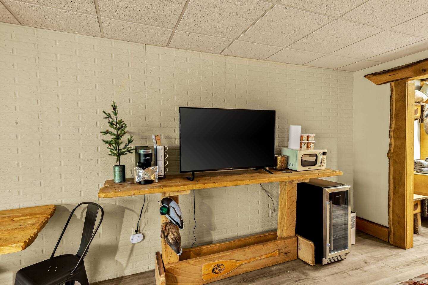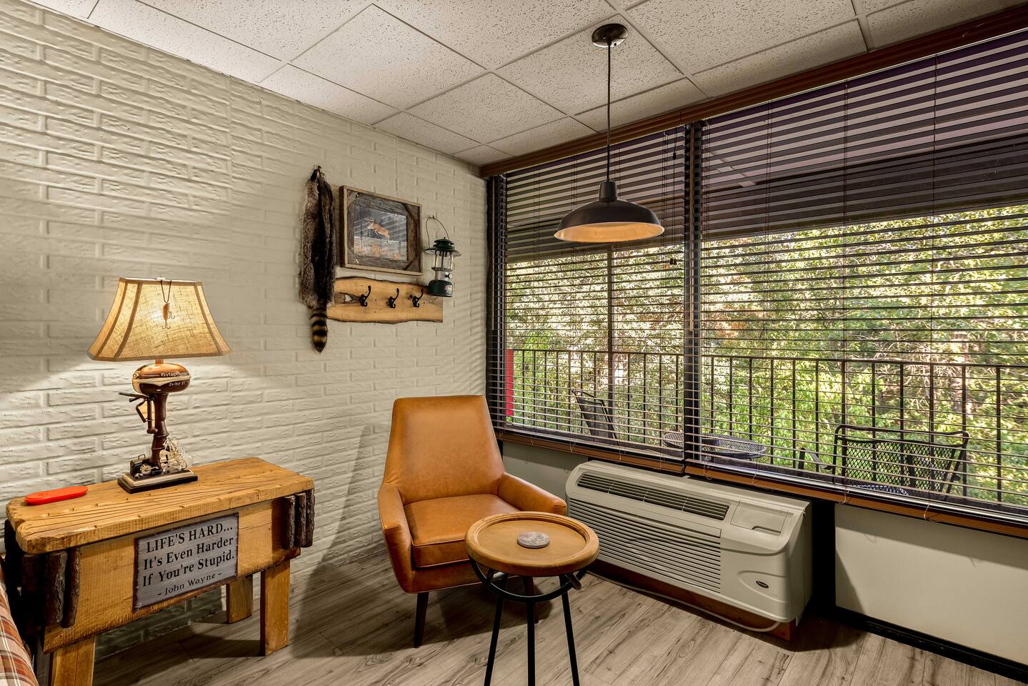 A studio style ground floor unit on the back side of the building, facing the woods. A good choice if you want a quieter experience. It requires climbing down a few steps to the back level. • Dining table w/ 2 chairs • Microwave & Minifridge • Keurig coffee maker w/ locally roasted coffee, creamer, & sugar • 2 Mountain Valley Spring Waters & Bob’s Oatmeal Cups • Covered table w/ 2 chairs outside your room • White noise maker for sleeping • Bedside USB phone/device charger. THE BUILDING & COMMON AREAS: • Saltwater Pool • 2 Fire Pits • Covered Pavilion • Ice machine & water, soda vending machine • Onsite Parking • Pet relief area