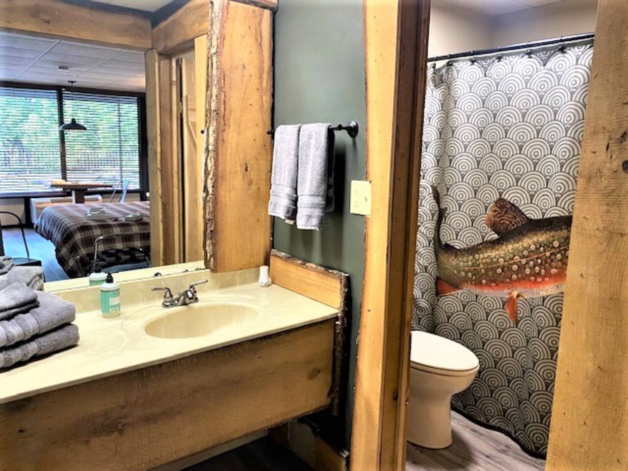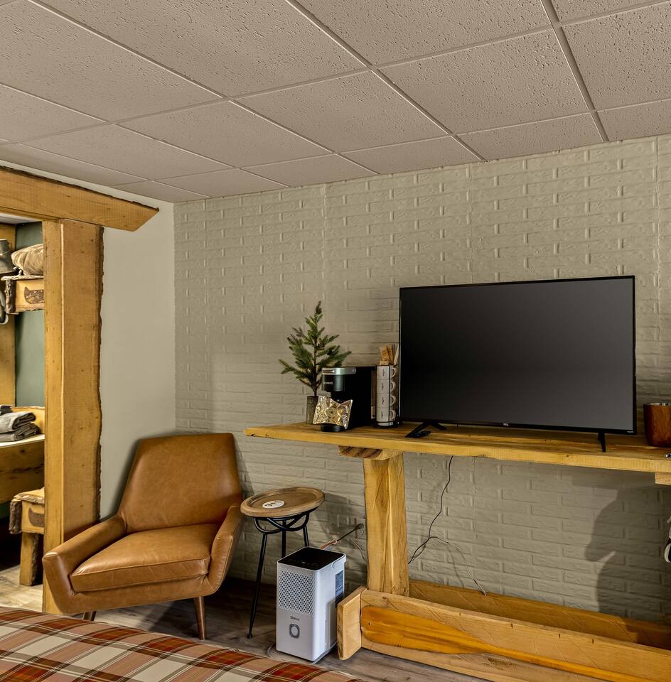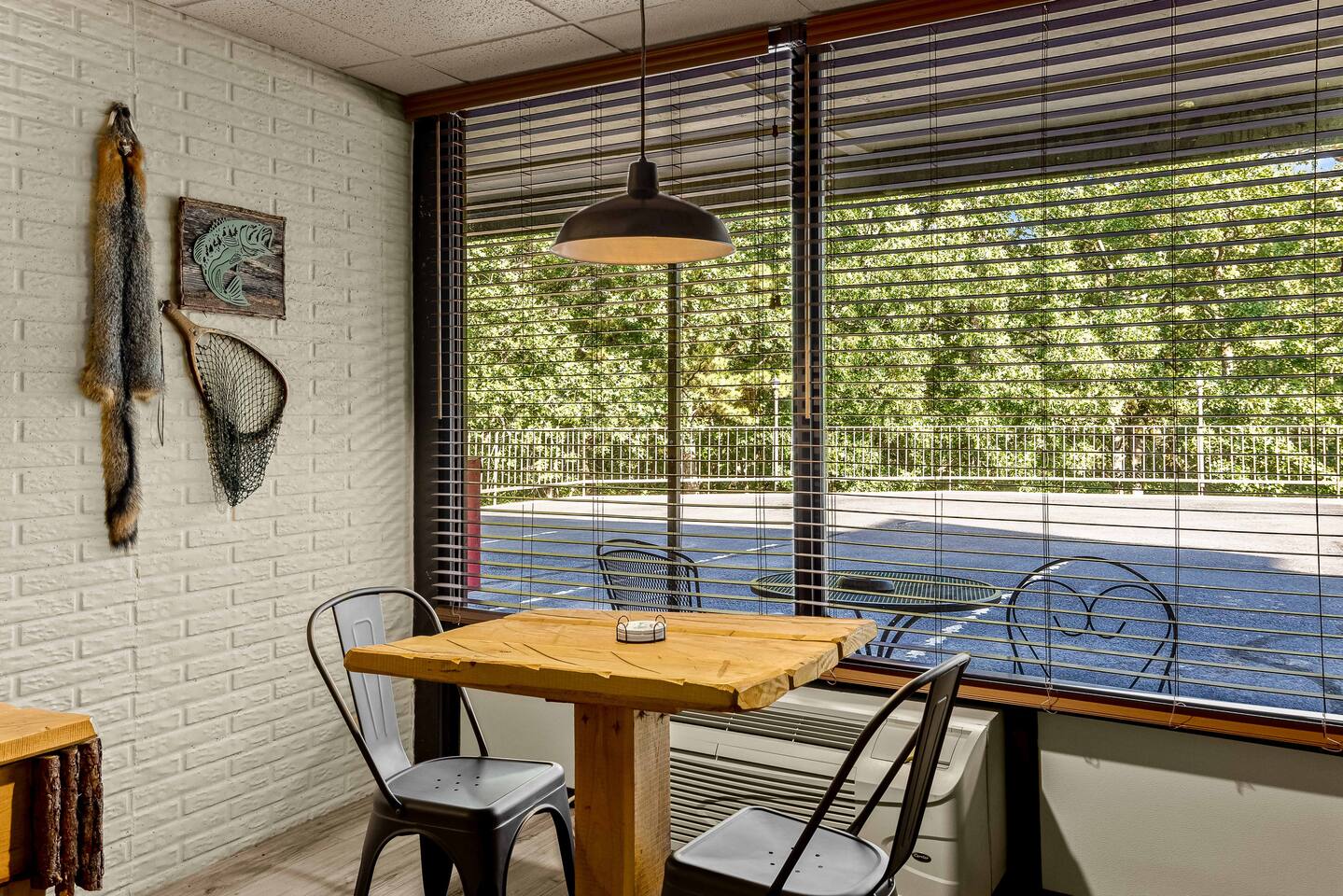 Room # 108 is a studio style unit on the ground floor on the back side of the building, facing the woods. A good choice if you want a quieter experience. • Dining table w/ 2 chairs • Microwave & Minifridge • Keurig coffee maker w/ locally roasted coffee, creamer, & sugar • 2 Mountain Valley Spring Waters & Bob’s Oatmeal Cups • Covered table w/ 2 chairs outside your room • White noise maker for sleeping • Bedside USB phone/device charger. • Guests may use the Roku TV to access their own personal steaming platforms. THE BUILDING & COMMON AREAS: • Saltwater Pool • Fire Pit • Covered Pavilion • Ice machine & water, soda vending machine • Onsite Parking • Pet relief station