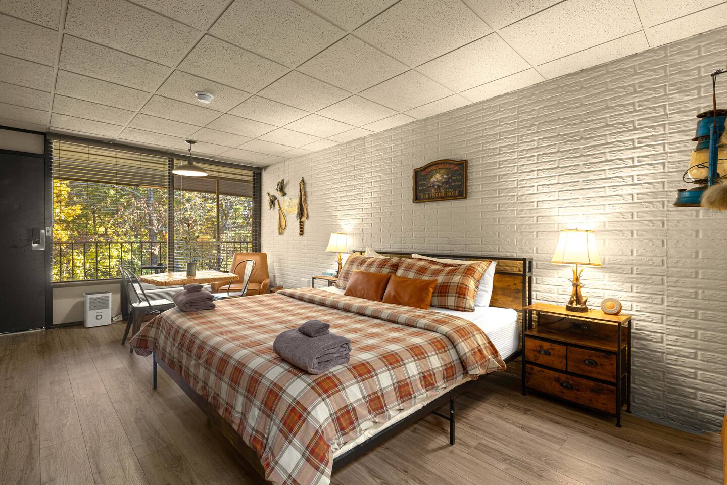 This lodge style Airbnb motel is the perfect mix of comfort, vintage style, and rustic touches. A popular stop for mountain bikers, motorcyclists, and adventure seekers! 2 mi. from HISTORIC DOWNTOWN Eureka Springs 4 mi. to Thorncrown Chapel 6 mi. to Lake Leatherwood 12 mi to Beaver Dam KEY FEATURES: ☀ Plush King-sized Bed ☀ 50” Roku TV ☀ Salt Water Pool ☀ Fire Pit & Covered Pavilion ☀ Eureka Springs Trolley Stop ☀ Ziplining, Canoe & Kayak Rentals Nearby