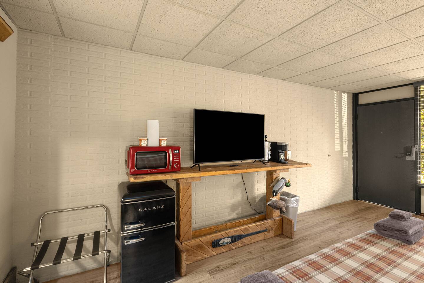 A studio style ground floor unit on the back side of the building, facing the woods. A good choice if you want a quieter experience. It requires climbing down a few steps to the back level. • Dining table w/ 2 chairs • Microwave & Minifridge • Keurig coffee maker w/ locally roasted coffee, creamer, & sugar • 2 Mountain Valley Spring Waters & Bob’s Oatmeal Cups • Covered table w/ 2 chairs outside your room • White noise maker for sleeping • Bedside USB phone/device charger. THE BUILDING & COMMON AREAS: • Saltwater Pool • Fire Pit • Covered Pavilion • Ice machine & water, soda vending machine • Onsite Parking • Pet relief station